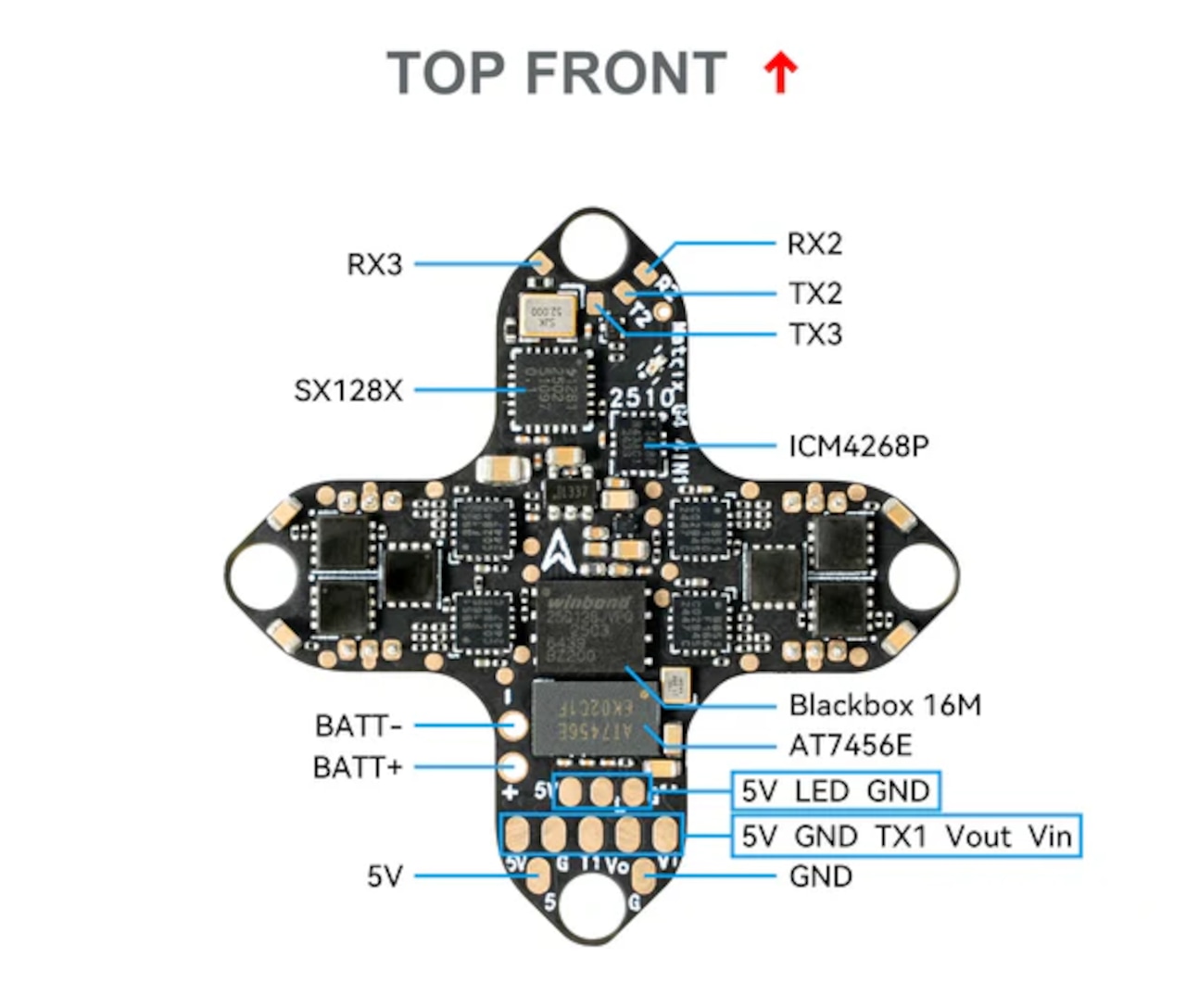 4IN1 には外部 VTX はんだ付けパッドが装備されており、プロトコルの柔軟性が向上します。