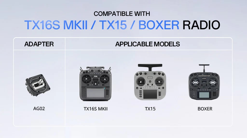 旧世代製品との 100% の取り付け互換性: すでにフルサイズの RadioMaster ジンバルを使用している場合は、変更を加えることなく、AG02 をアップグレードとして直接インストールできます。