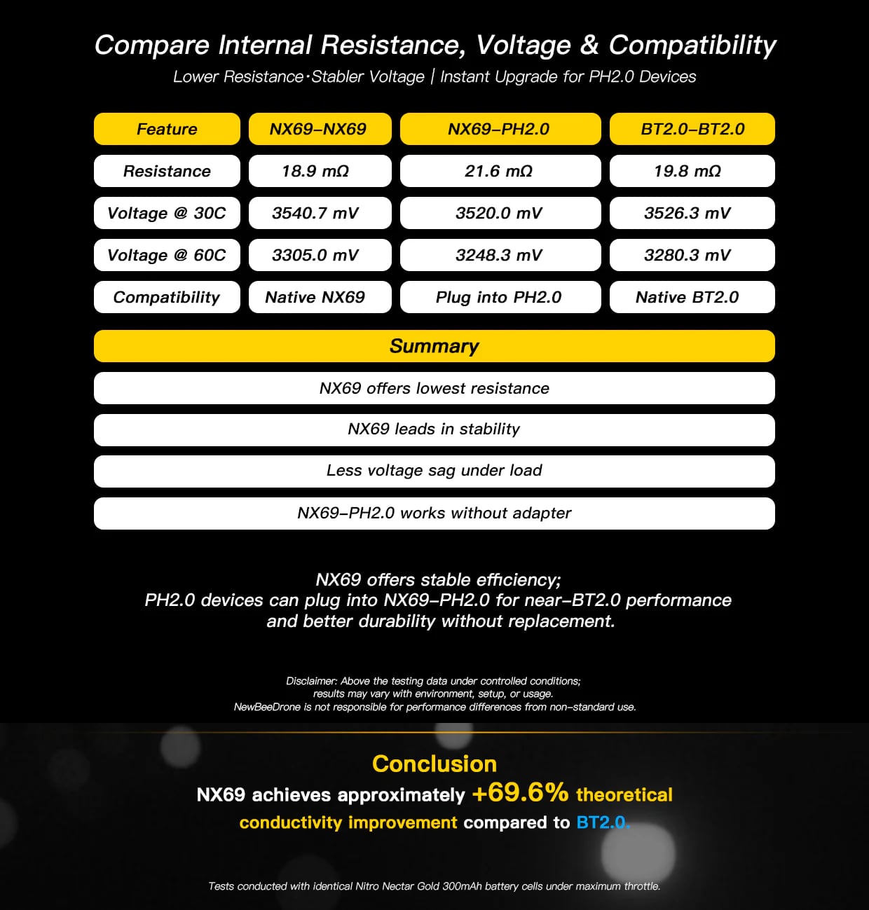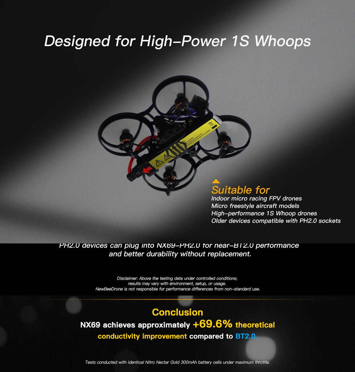 優れた導電性を実現する設計純銅(0.85mm²、ドローン側)と大型真鍮コンタクト(1.34mm²、バッテリー側)を採用したNX69は、 BT2.0と比較して理論上69.6%の導電性向上を実現しています。