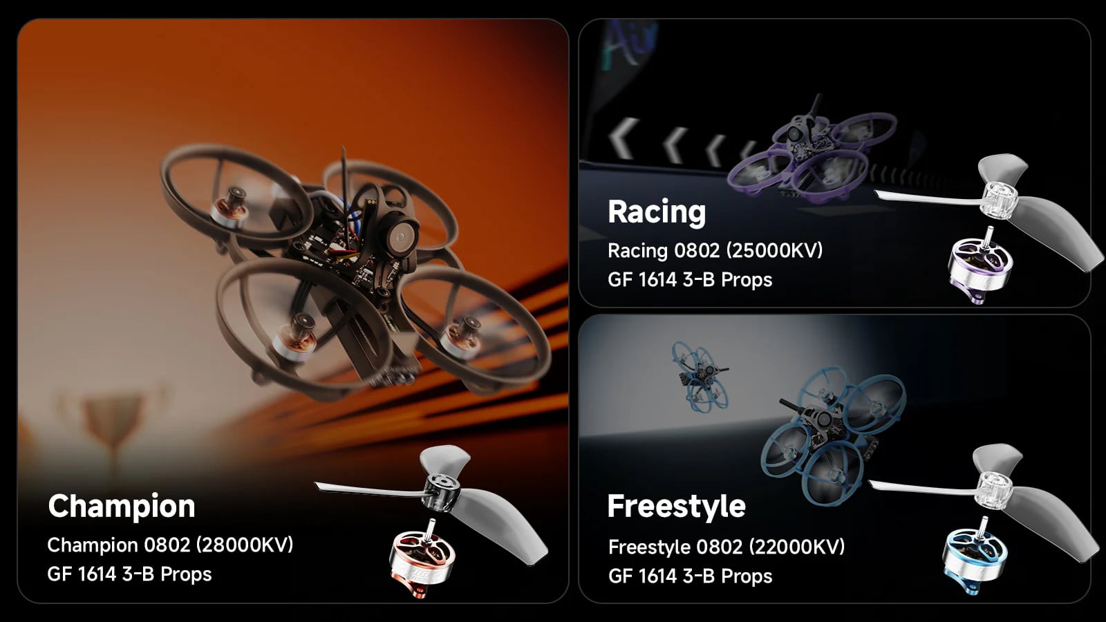 その中核となる専用推進システムは、チャンピオン、レーシング、フリースタイルの3つの異なる構成を提供し、それぞれにモーターとプロペラの組み合わせを最適化し、推力、レスポンス、そして操縦性を向上させます。