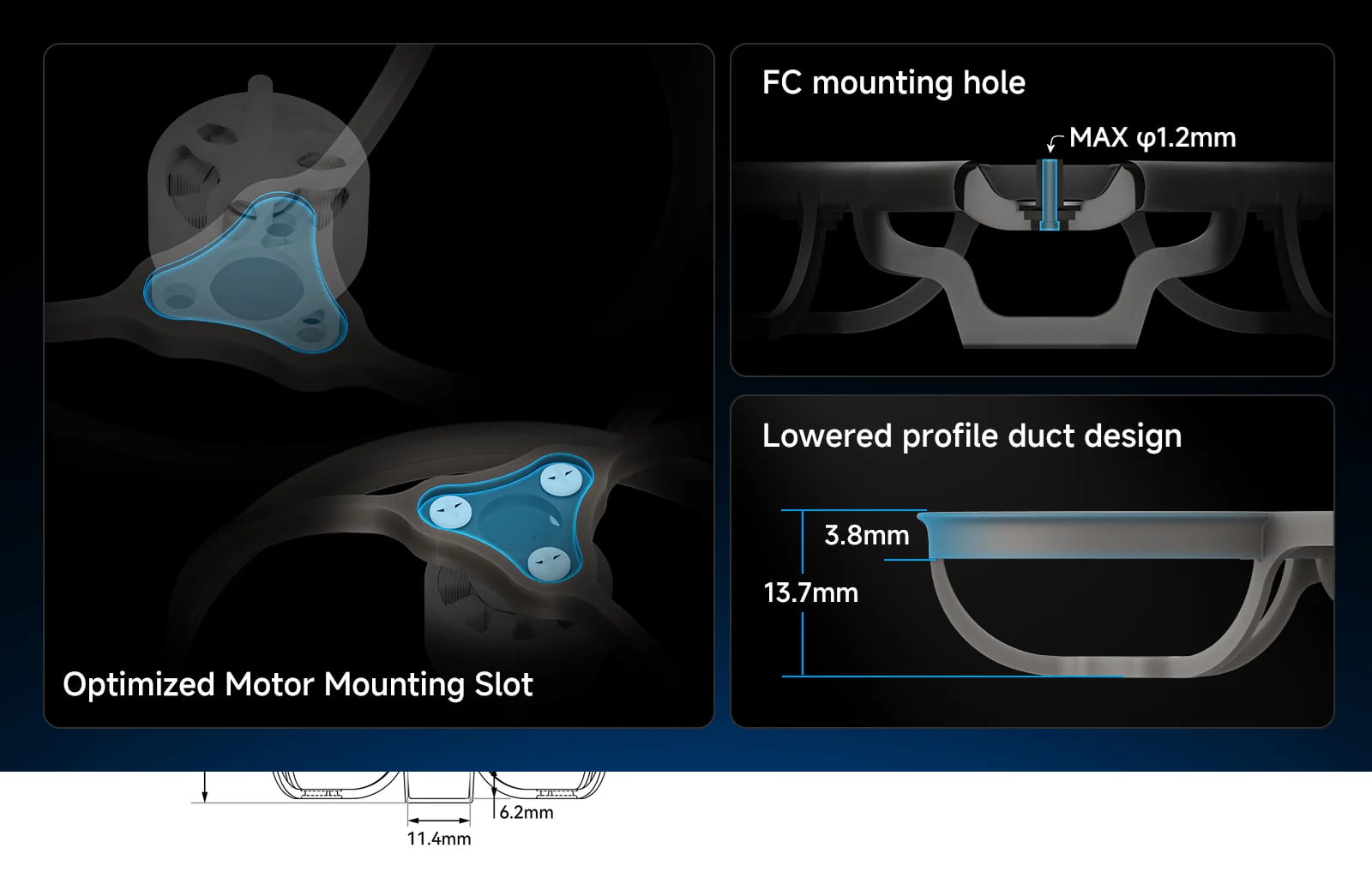12.4mm低くしたダクトと3.8mmのスリムなプロファイルを組み合わせることで、ショートキャノンモーターに十分なクリアランスを確保し、プロペラのエアフローを最適化してスムーズで効率的なパフォーマンスを実現します。