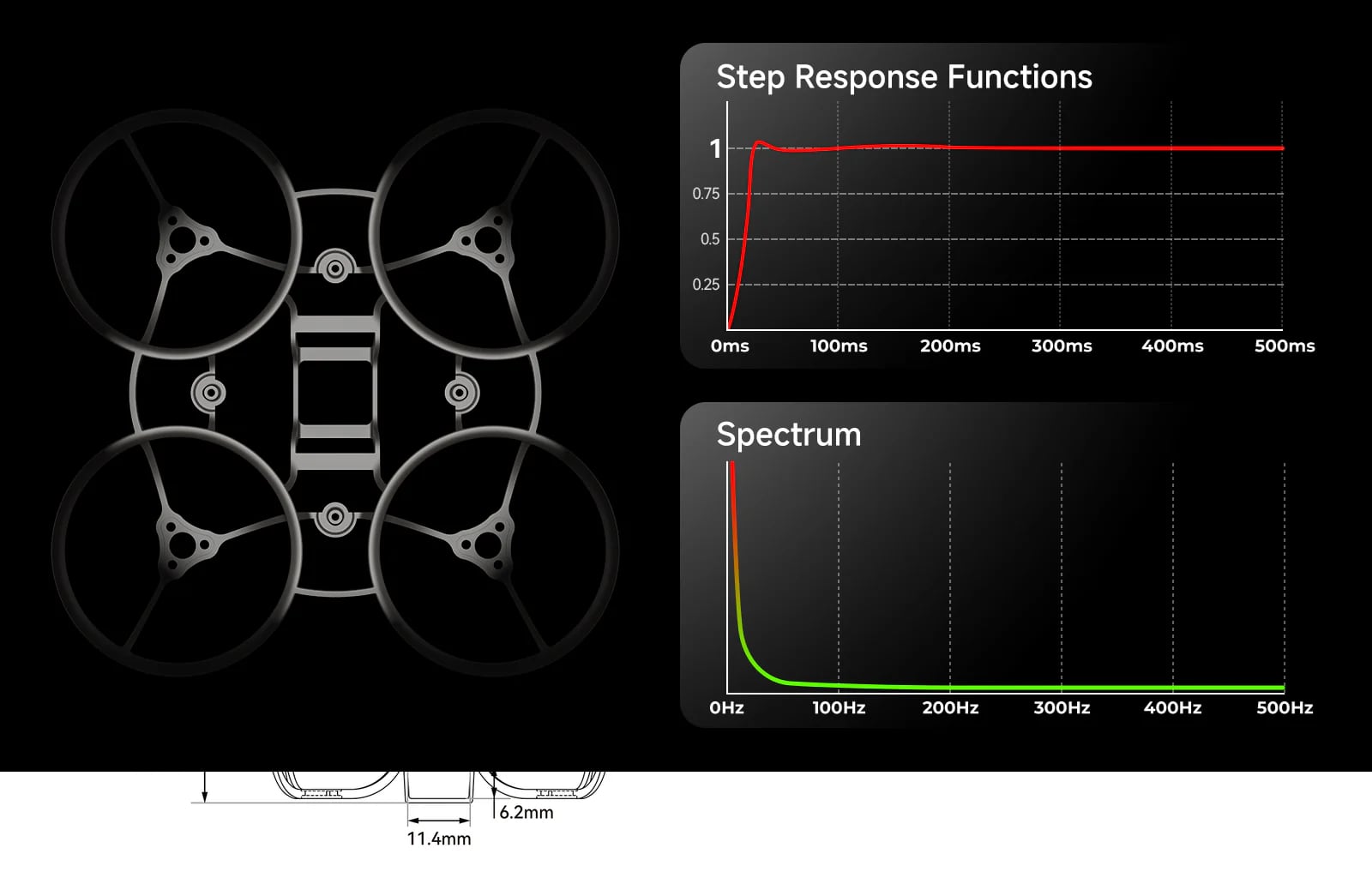 最適化されたダクトと接続構造により、フレームの振動を低減しながらも推進力を高め、ほぼ完璧なPIDレスポンスと驚くほど俊敏なハンドリングを実現しています。