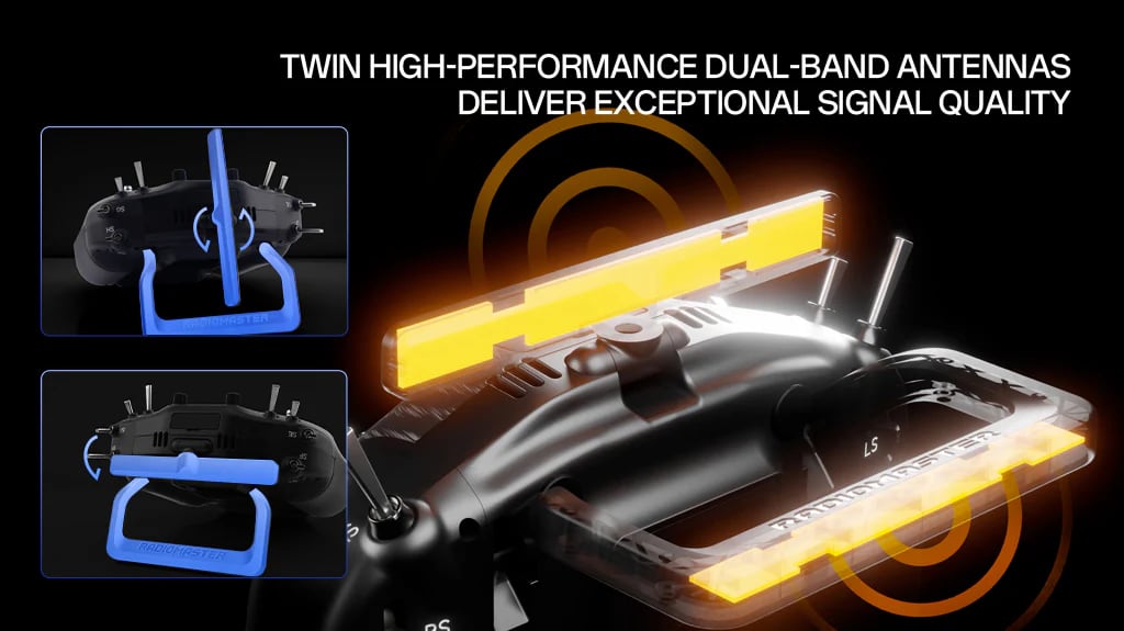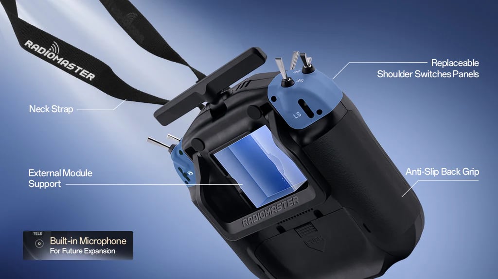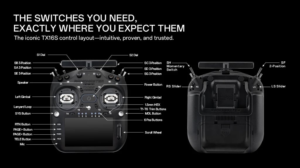 TX16S MK3 Standardは、新しいV6クワッドベアリングホール効果ジンバルを搭載し、AG02精度と安定性を向上させるため、トラベル、センタリング、テンションを外部から調整することで、好みに合わせて操作感を微調整できます。