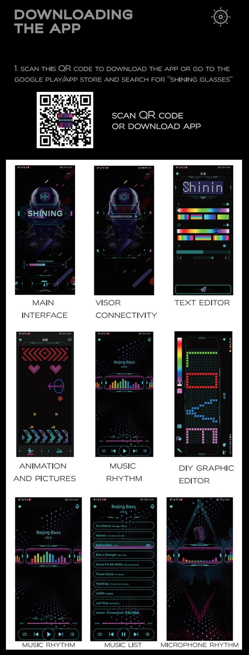 付属の QR コードをスキャンするか、APP ストアで「Shining Glasses」を検索してください。