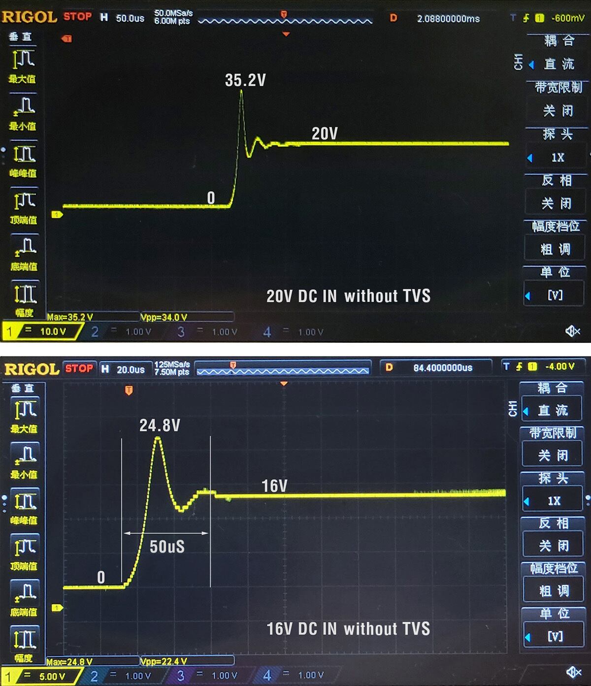 2x 高出力 TVS ダイオードと 1x 470uF 低 ESR コンデンサをボード上に搭載