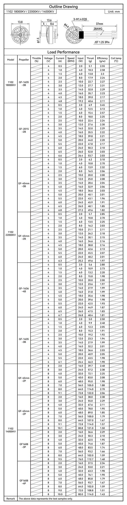 1102 22000KV はより高い RPM とより速い応答を備えているため、クアッドコプターはより少ないスロットルでより多くのパンチで離陸することができます。