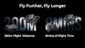 1100mAhのバッテリーを搭載しており、飛行時間は8分、最大飛行距離は200メートルです。