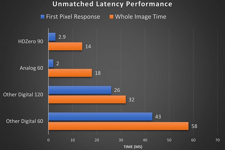 このカメラにより、HDZero はアナログ 60i ビデオより 5 ミリ秒速くなり、フィールド/フレーム全体を表示できます。