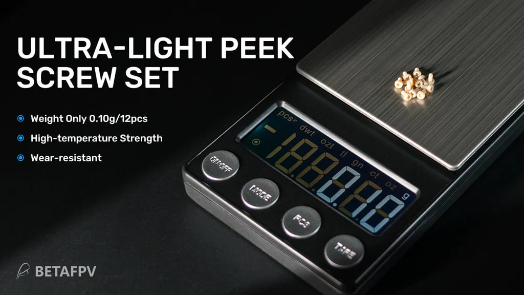 PEEK ネジの重量は 12 個あたりわずか 0.10 グラムで、金属ネジを使用したビルドでは最大 0.46 グラムの軽量化が可能で、ナイロンネジよりも強度と耐久性に優れています。